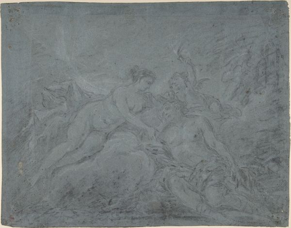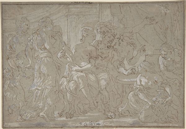 This drawing of Mucius Scaevola crossing the Tiber is by an anonymous artist, rendered in pen and brown ink with brush and grey wash. The composition presents a study in contrasts. The solidity of the figures stands starkly against the fluidity of the Tiber River. Lines are used sparingly, yet they define the muscularity of Scaevola and the folds of his garments, creating a sense of depth and movement. Notice how the artist plays with light and shadow, particularly on the figures' contours, which imbue the scene with dramatic intensity. The act of Scaevola embodies a defiance, challenging the established order through self-sacrifice. The artist uses a semiotic language of heroism and resistance. The grey wash blurs the lines, allowing the figures to emerge from and recede back into the background. Consider the ways in which this artistic choice, although simple, destabilizes our understanding of heroism. This drawing prompts us to reconsider the boundaries between courage and madness.