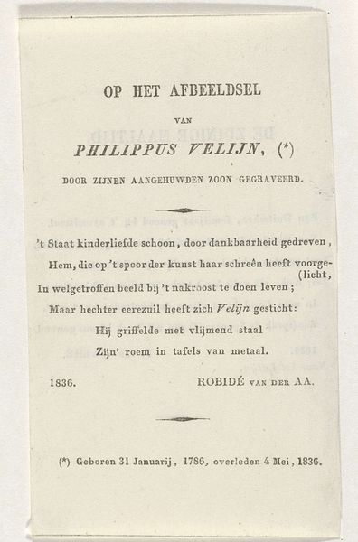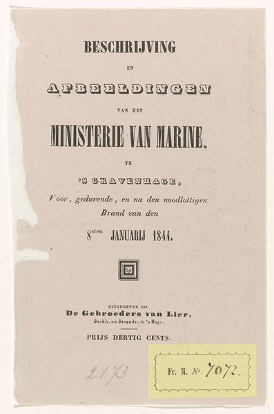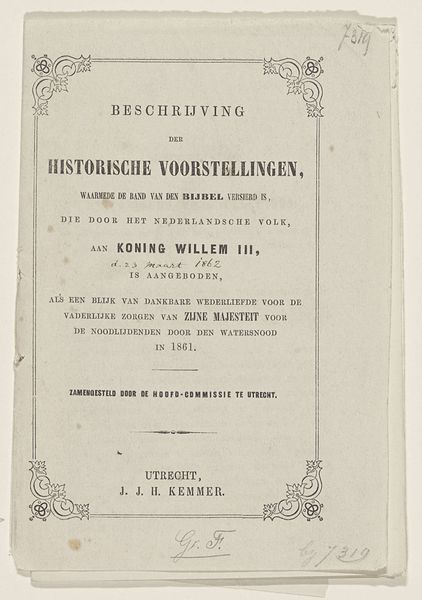 Curator: This understated poster, printed in 1874 by Tresling & Comp., serves as an announcement. It’s titled, in Dutch, "Explanation of the Plates of the Procession at the Celebration of the 25-year Reign Anniversary of King Willem III in Amsterdam." What are your immediate impressions? Editor: Honestly? It whispers more than it shouts. The typography feels restrained, almost… fragile. It gives me a nostalgic yearning, as if holding a secret. The simple design hints at something grander, almost teasing the imagination. Curator: Indeed. As a formal piece, we observe a hierarchical arrangement in three distinct acts announced, each promising a visual spectacle. From “The Seven Orange Groups,” perhaps alluding to the House of Orange, to “The Group of Gold and Silversmiths," finally culminating with the spectacle of "The Parade Floats”. Note the simple elegant frame as well. Editor: The type almost breathes like a carefully curated collection. A simple serif typeface; notice the slight curves on the letter "t." All of the elements carefully compartmentalized by these crisp lines. I'm picturing the Amsterdam of that era. The print embodies a quiet but firm pride, even reverence. This must have been something to behold. Curator: I agree. What also captures my attention is the collaborative nature implied—various designers contributing to these spectacular events. R. Craeyvanger for the first, W. B. Ijserdraad for the second, and J.L. Springer for the third, indicating a community engagement around royal celebration. Editor: Right. It goes beyond just informing, doesn’t it? It's like an invitation to imagine this parade in all its colorful, historical splendor—like setting the stage for a memory. The very restraint makes me appreciate the artistry all the more. There is such artistry in this typography, a careful selection of font size to suggest both harmony and grandeur. Curator: Absolutely. I will hold onto my curiosity as I wonder how people reacted back then, seeing the printed promise of spectacle juxtaposed with its subtle execution. I now look forward to looking for accounts and photos of what took place on that special day in 1874.