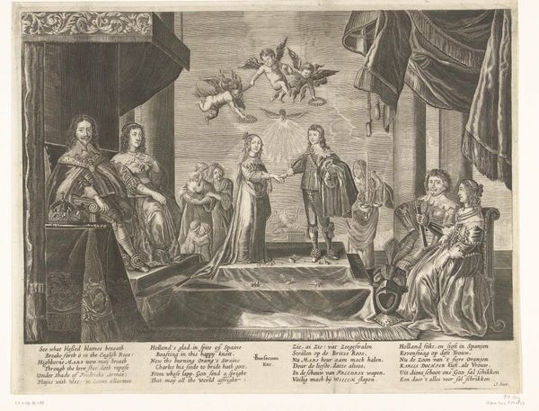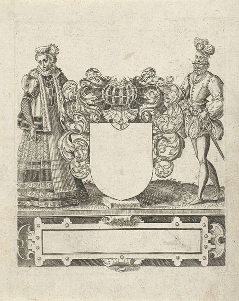 This portrait of Enno Lodewijk, Count of East Friesland, and Henriëtte Catharina, Princess of Orange, is a print made by an anonymous artist. The printmaking process is crucial to understanding its social context. Prints like this one were relatively inexpensive to produce, and could be widely distributed, making them an ideal way to disseminate images of power and status. The fine lines and details were achieved through the skilled labor of a trained engraver, meticulously cutting into a metal plate. The result is a precise, repeatable image that could be shared with a broad audience. Notice how the composition emphasizes wealth and privilege, with elaborate clothing, symbolic objects, and architectural details. These elements, carefully rendered by the printmaker, reinforce the social standing of the sitters and the power structures of their time. Ultimately, this print is more than just a portrait; it's a carefully crafted artifact that speaks to the complex relationship between art, labor, and social status in the 17th century.