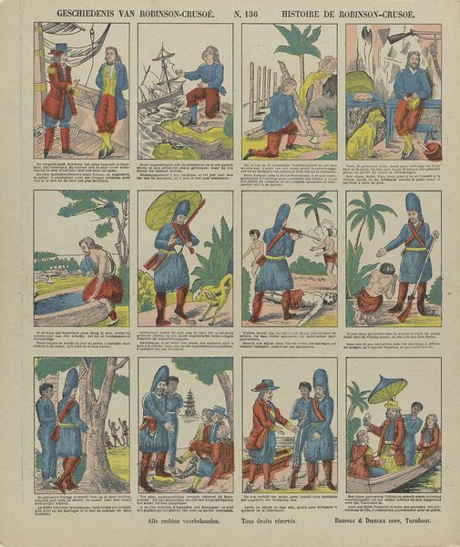 Editor: This is "Robinson Crusoe," made sometime between 1822 and 1849 by Jan de Lange II. It's at the Rijksmuseum now. I'm struck by how it reads like a comic strip, almost a proto-graphic novel, chronicling moments from the story in these small vignettes. What symbols jump out at you in this piece? Curator: Well, consider the very image of Crusoe himself. Isolated, initially naked then clad in skins, he embodies the European conception of the 'noble savage' confronted with nature. His changing costume signifies cultural and psychological transformation as the castaway remakes himself. Editor: Interesting. So, even his clothing is a symbol? Curator: Precisely. Each object—his hat made of leaves, the axe, even the small parrot he shelters—speak volumes. These weren't just tools or companions; they are cultural trophies of ingenuity and resourcefulness. Editor: What about the palm trees? They appear in nearly every panel. Curator: The palm trees and island setting stand for exoticism and unknown potential, but also danger. What does the shipwreck on the horizon suggest? Editor: A constant reminder of his former life and civilization lost? Curator: More than that: a challenge to rebuild it. Think about Crusoe planting seeds, building shelter. He reconstructs society from the ground up. Each small scene encapsulates this process of adapting and overcoming. Editor: It’s incredible how much narrative weight these little scenes hold! I see that there's so much going on that I had previously missed when considering cultural background. Curator: Indeed, even the composition directs the narrative – panel to panel – mimicking not just Crusoe's physical journey, but a journey of symbolic reclamation and psychological strength.