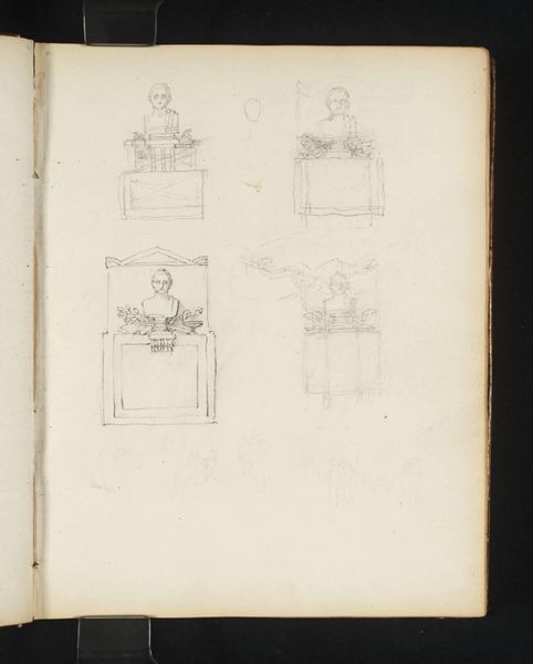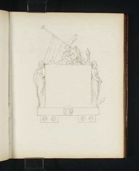 Editor: Here we have an untitled sketch by John Flaxman, held in the Tate Collections. It’s rather faint, isn’t it? Almost ghostly. What do you make of these altar-like structures, and those helmeted figures looming above? Curator: Ah, Flaxman! He saw the world through classical lenses, didn't he? These sketches feel like whispers from antiquity, imagined monuments perhaps? What stories do you think they might tell? Editor: Maybe tales of forgotten heroes? Or designs for memorials that never were? It's fascinating to see the genesis of an idea, so raw and unformed. Curator: Precisely! It’s like glimpsing the artist's thought process. The sketch's simplicity invites us to fill in the blanks, to conjure our own narratives. It’s a dance between artist and observer, don’t you think?