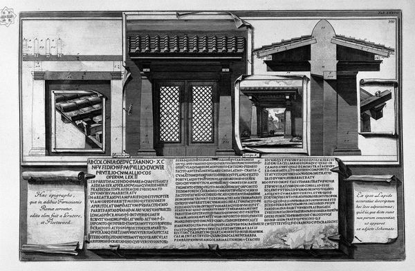 Curator: This etching, titled "Details of Greek and Roman Monuments," is by Giovanni Battista Piranesi. He worked extensively documenting and imagining Roman architecture. Editor: It's so detailed! A real archive of forms. There’s something very satisfying about the arrangement; like a catalog, or a series of perfectly arranged specimen. Curator: Yes, and the catalog arrangement of it becomes very interesting. The organization of discrete architectural details and renderings together hints at a cultural longing for the Classical ideal. Think about what those geometric shapes represent: rationality, order, enduring values… Editor: While also displaying different building methods. The precision of the etched lines emphasizes the materiality of the original structures – stone, marble – and the sheer labor involved in quarrying, carving, and assembling these elements. How the construction was realized. Curator: Absolutely. Beyond mere record keeping, Piranesi highlights symbolic language within classical forms – the stoic strength embodied in Doric columns, for example. Note how he’s also emphasizing line, geometric form and order within decorative architecture in both civilizations. Editor: But look at the contrast: clean lines juxtaposed with weathered textures. Piranesi's mark-making almost creates a tension between the intended grandeur and the decay of time and consumption. Curator: Decay is natural and expected though, whereas these motifs that are repeatedly invoked offer a kind of immortality… Or at least a hope for one! What endures? Editor: And what value does it retain? Etchings like these were commodities, spreading ideas about Classical design, influencing the design and methods of building new architecture. Curator: They become prototypes. Editor: Almost instructions, disseminated widely. Studying this image, I appreciate the weight of the material, how each component impacted culture – and I still think it looks like an expertly crafted study. Curator: For me it remains potent for the emotional depth invested in seemingly 'cold' geometry. Thanks for joining me as we looked back through "Details of Greek and Roman Monuments" with these multiple meanings today.