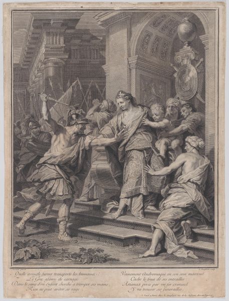 Editor: Here we have "The Wolf Rings the Bells of a Convent from Hendrick van Alcmar's Renard The Fox" created between 1650 and 1675 by Allart van Everdingen. It looks like an etching, giving it that intricate, almost storybook feel. It feels pretty satirical; I wonder, what is this image trying to tell us? Curator: This print comes from a series illustrating "Reynard the Fox," a medieval cycle of fables popular throughout Europe. This scene depicts a topsy-turvy world, right? What’s being subverted here? Think about power dynamics and institutions of authority. Editor: Well, the wolf, traditionally seen as a predator, is being led, seemingly captive, to ring the convent bells. The monks appear distressed, hands thrown up in alarm. It suggests chaos, maybe even a critique of religious authority? Curator: Precisely. Consider the context: the 17th century saw significant religious and political upheaval. These fables, while entertaining, often served as veiled social commentaries, allowing artists to critique the powerful—the church, the nobility—under the guise of animal stories. Think about how readily accessible this print would have been compared to, say, an oil painting displayed for a limited elite. The democratization of imagery… does this narrative feel modern to you? Editor: It does. The idea of using animals to satirize human behavior, that resonates even today. It’s thought-provoking to consider how the political climate influenced artistic expression like this, distributed to wider audiences. Curator: And how the printing press changed the art world forever, democratizing access to images. So what did we learn from this comical scene? Editor: I'm seeing it as more than just a funny animal story; it’s a snapshot of a society questioning its established structures, cleverly masked within popular narratives. Curator: Exactly. These images could bypass censors more readily because of the implicit plausible deniability, making this etching is a powerful historical object and a really neat picture.