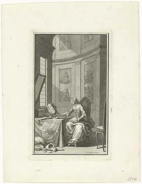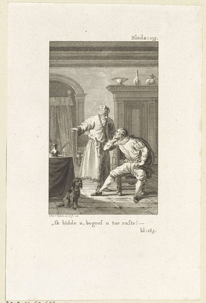 Reinier Vinkeles made this etching, titled "Man wordt een vertrek uit gejaagd met een stok" - "A Man is Chased Out of a Room with a Stick" - using the labor-intensive technique of etching, a printmaking process involving the use of acid to create the image on a metal plate. The scene's social context emerges from the print’s sharp lines: a powdered lady, a sword-wielding gentleman, and a man being forcefully ejected. The very precision of the etching emphasizes the social dynamics at play. The etching process, with its reliance on skilled labor and painstaking methodology, mirrors the societal structures of the time. Each line, each shadow, is a testament to the hand of the artist, a tangible reminder of the labor involved. Vinkeles’s work bridges the gap between craft and fine art, inviting us to see the social narrative embedded within the materials and processes of its making.