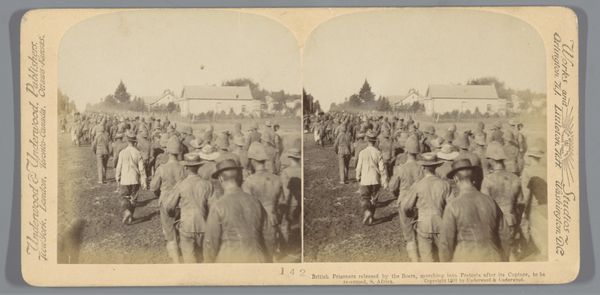 This photograph, "Het leger van Lord Roberts trekt op richting Johannesburg," captures a moment frozen in time by an anonymous photographer using a stereoscopic camera. The sepia tones and the stereoscopic format gives a feeling of depth to the subject matter, creating an immersive visual experience. The composition is structured around the linear progression of troops and horses leading into the distance, punctuated by the floating balloon. The texture, visible in the dusty ground and the rough uniforms, adds a tactile quality to the scene. The photograph serves as a document but also as a study in contrasts: the grounded, earth-bound soldiers versus the ethereal balloon, or the linear march against the chaotic arrangement of figures. These formal elements underscore the instability and complex semiotics inherent in the visual depiction of war and military campaigns. The use of the stereoscopic format enhances the viewer's sense of presence, complicating our understanding of distance and perspective.