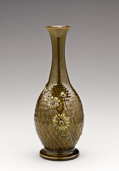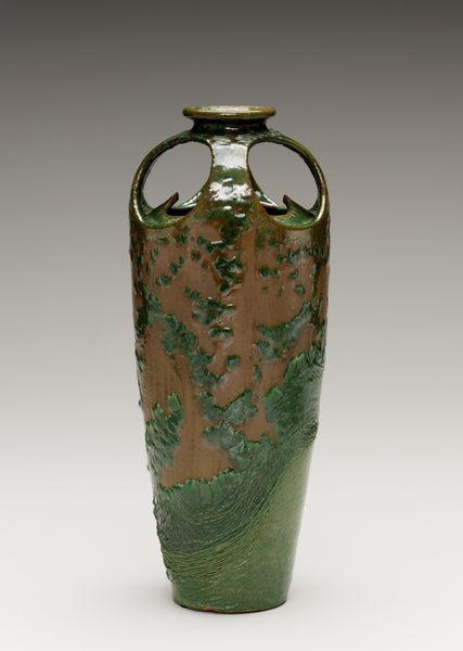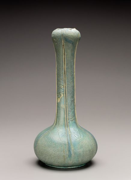 Curator: Welcome. Before us stands a ceramic "Vase" created by Charles Volkmar between 1897 and 1913, a compelling example of the Art Nouveau movement currently housed in the Metropolitan Museum of Art. Editor: My first impression is serenity. The muted green glaze, the subtly elongated form… It’s incredibly calming, almost meditative. Curator: Indeed. Structurally, consider the lines incised into the vase's surface. They lengthen and curve, mirroring the natural forms highly favored by the aesthetic of Art Nouveau. They undulate—creating a unified, cohesive visual rhythm that travels upward. Editor: The stylized flower motif is centered in this movement and calls back the symbolic associations between flora and fertility present in so many cultures of the time. Even its light green evokes renewal and growth. I am compelled to contemplate springtime celebrations. Curator: You touched on the point there; The green isn’t just any shade, either—note the matte finish that absorbs rather than reflects the ambient light. Editor: It really grounds the whole experience. Makes it feel very ‘of the earth.’ Was Volkmar conscious of this deeper, even spiritual symbolism, or was it simply an intuitive design choice, to integrate the vase into interior space like an organic fixture? Curator: It’s difficult to ascertain definitively Volkmar’s intentions without documentation. I am drawn, too, by the overall texture. Observe the fine granularity across the ceramic body—a deliberate counterpoint, softening what might have been sharp definition. The slight variation within the tone enhances its organic presence, providing complexity within its otherwise singular color profile. Editor: It seems the Art Nouveau artisans were trying to reconnect the industrial revolution to the vital and emotional resonance that people long for within handmade and traditionally created goods. Even within what looks simple—like these faint flower and nature images—lives cultural continuity. Curator: Agreed. I think this analysis of this piece proves its success within its particular style. Editor: Yes, these careful constructions of color, line, and reference truly carry complex feeling and intention, beyond mere ornament.