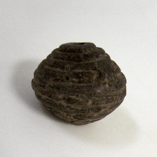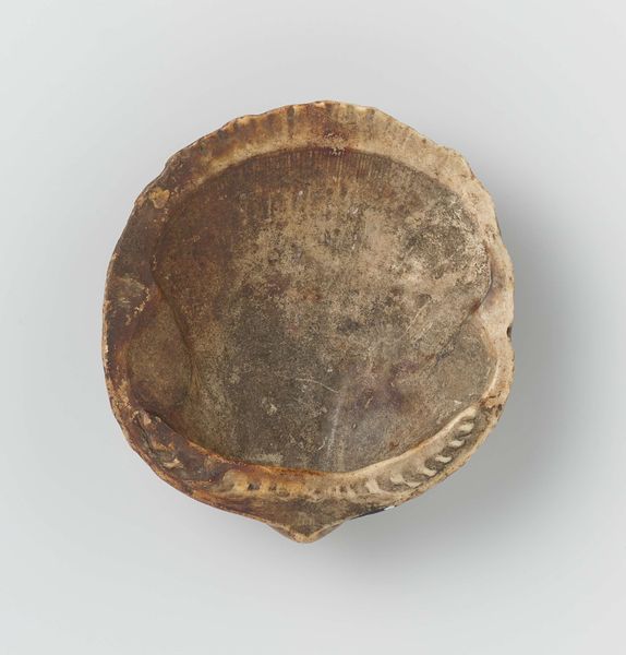 Editor: We're looking at an anonymous stoneware piece from around 1590-1596 at the Rijksmuseum, called "Knoop, rond afgeplat met decoratief patroon", or "Button, Round Flattened with Decorative Pattern." It looks a little rough around the edges, like a handmade object. How should we approach the viewing of such an ordinary, useful, and anonymous item? Curator: Let’s start with its materiality. Stoneware itself tells a story. Consider the labour involved in extracting the clay, preparing it, the firing process – a whole chain of production is embedded in this humble button. Do you notice the subtle patterns on its surface? Editor: Yes, I do. They seem almost accidental, or perhaps created with a very simple tool. Is there any way of knowing more about its fabrication? Curator: The roughness, the apparent simplicity of the decoration, suggests it wasn’t intended for the elite. This was likely mass-produced for common clothing. This reveals something vital about daily life at the time. Editor: So, this simple object provides insight into broader consumption and labour practices in the 16th century. I would have missed that by merely focusing on aesthetics. Does the form suggest anything to you about it? Curator: Consider how easily something like this could be replicated by other craftspeople in various regions at the time. This stoneware button connects directly to broader economic realities and material constraints. We can study these qualities to look at larger distribution. Editor: I guess analyzing something so simple can still lead to very profound ideas about economics, fabrication and culture! Curator: Precisely! Everyday objects are just as critical to understanding history as grand paintings or sculptures.