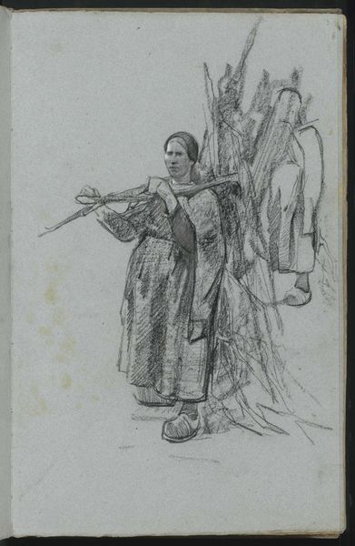 Willem Witsen made this drawing, *Jonge vrouw met takkenbos,* using graphite pencil on paper. The monochromatic tones are achieved by layering thin strokes that build up to darker areas, giving volume to the figure of the young woman carrying firewood. The quickness of the marks gives the impression that it was sketched on-site, perhaps capturing a fleeting moment from everyday life. The marks are more pronounced on the bundle of sticks and the figure's clothing than on her face, emphasizing the weight of the wood she carries and the coarse texture of her clothing. The focus on these details highlights the labor and hard work involved in gathering and carrying firewood. Witsen's choice of a humble subject, as well as the sketch-like quality of the drawing, blurs the boundaries between fine art and everyday representation, reminding us that the value of art lies not only in its subject matter but also in the artist's ability to bring attention to the unnoticed aspects of life through skillful use of materials and techniques.