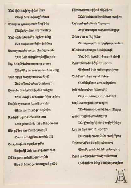 Editor: This looks like a page from "Uitleg bij een kalender", or Explanation of a Calendar, by Claes Jacobsz. Paets, dating from around 1600. It’s a print on paper, and immediately the archaic typography catches my eye. I find it difficult to read. What do you see in this piece, from a symbolic standpoint? Curator: What I see is an effort to codify time itself, rendered in the visual language of its era. Typography, choice of paper and ink—all are signifiers. This isn’t just a calendar; it's a claim on knowledge, almost a spell for understanding the year's passage. Notice the visual hierarchy – certain months, certain phrases are highlighted. Editor: Yes, I noticed the use of red ink for certain words! Does the use of red versus black ink have a particular significance here? Curator: It certainly does. In illuminated manuscripts, red often signified importance or divine intervention, things set apart. It suggests the information presented here is more than mundane; it's imbued with a sacred dimension. Consider how calendars in this period were tied to both agriculture and religious observances. The visual echoes these beliefs. It almost feels as if the words contain magic or provide an incantation. Editor: So it is speaking to a worldview where time and the sacred were inseparable, presented in a language accessible to those who understood these visual codes? Curator: Precisely! The choice of script, the coloring, the very act of printing—all are symbolic gestures aimed at giving structure and, arguably, meaning to the year. This isn't merely about dates; it's about humanity’s relationship with time and the cosmos. Editor: That's fascinating. I hadn't considered the symbolic weight of the printing itself. Curator: Thinking about art as more than just aesthetics and also something communicating important cultural memory gives it even more meaning to me.