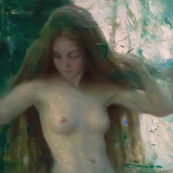 Curator: Standing before us is "Bather II", an oil painting by Joshua LaRock. Editor: Well, it immediately feels so classically familiar, yet somehow very intimate. A woman, seen from behind, is standing in water, holding what appears to be a white cloth. The lighting is soft and almost dreamlike. Curator: LaRock really plays with that classical sensibility. He’s clearly working within a tradition of figurative and nude studies, evoking academic art styles with a foot in realism. The muted palette against her illuminated skin—it recalls a history of bathing women in art. Editor: Yes, it’s got that very studied and almost self-aware sensuality but there is still an elusive quality. Is she emerging from the water? About to step in? The narrative is completely open, isn't it? It resists that objectifying male gaze through its framing, the focus on form and light rather than explicit detail. It’s incredibly modern in that way. Curator: Absolutely, you pinpoint the nuance perfectly! It’s interesting how artists continue to return to these tropes, navigating and subverting the historical implications. Do you see a critical dialogue with older masters here? It could open a discussion around artistic license within certain parameters... Editor: Well, there's an underlying emotional vulnerability despite the subject matter, and the realism and treatment, if one accepts certain traditional assumptions and its relation to what we recognize about that type of presentation, gives it an entirely new aura in contrast. I almost wonder, would LaRock embrace or deflect comparisons to Bouguereau, for example? How does the 21st century treat those representations and ideals? I imagine not passively. Curator: Interesting. Maybe LaRock offers a space to consider how the nude figure can be reclaimed. A gesture of continuity with and dissent from traditional form that’s a testament to art’s ever-evolving dialogue with itself. Editor: A peaceful confrontation, I would hope. One bathed in painterly light and quiet defiance!