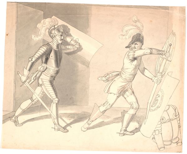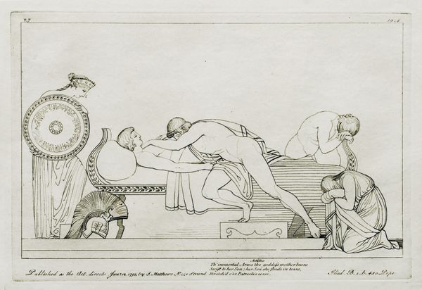 John Flaxman created this pen and ink drawing, "Illustration to the Iliad," during a time when Europe was captivated by classical antiquity. Flaxman, like many of his contemporaries, was deeply influenced by the art and literature of ancient Greece and Rome. In this illustration, we see a scene of violence and conflict taken straight from Homer's epic poem. Flaxman strips away the elaborate detail, focusing instead on the human form and the raw emotion of the moment. The figures, rendered in simple lines, embody classical ideals of heroism and strength. Yet, there's also a vulnerability in their poses, a reminder of the human cost of war. The fallen figure is a stark reminder of mortality, challenging any glorification of battle. Flaxman's neoclassical style emphasizes order and reason, but beneath the surface, the "Iliad" grapples with themes of fate, rage, and the complexities of human relationships, reflecting enduring aspects of our shared human experience.