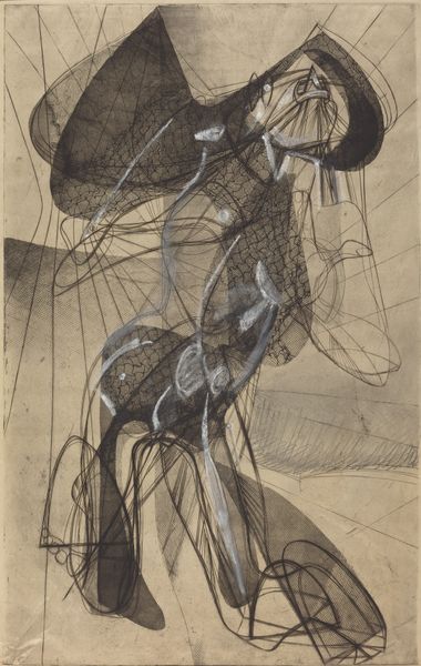 Curator: Here we have Stanley William Hayter's 1945 etching, "Amazon." Hayter, a British artist, was a key figure in the development of Abstract Expressionism, particularly his innovative printmaking techniques. Editor: Whoa, my first thought? Controlled chaos! I mean, look at that web of lines. It's energetic, but also feels strangely trapped. Like a wild beast caught in a beautiful, complex snare. Curator: That's insightful. Hayter was fascinated by the exploration of form and movement, channeling ideas on Surrealism, as evident through his use of abstraction. It is a fantastic example of exploring visual language from the war era. Editor: It's interesting you say visual language of the war era. Makes me wonder if "Amazon," given its title, is less about powerful women and more about conflict itself? Like this tangle embodies the psychological strain, even if its visually exciting. Curator: It could definitely be seen through that lens, reflecting the socio-political unrest of the time. There's a sense of instability in the overlapping forms that might well allude to a broader societal unease, and I find the contrast interesting in the print's clear medium. Editor: The white spots jump out so vividly against that dark etching, kind of puncturing the heavier mass, and making room for light, which does create a feeling of hope amidst what could have otherwise been read as doom. Curator: Exactly, these punctuations really reflect the impact Hayter had on mid-century Abstraction. As a print, it democratized fine art in that period, and made his practice ever so important to the post-war milieu. Editor: It makes me wanna grab some tools and just carve into something myself. It’s like looking into Hayter's artistic process; so dynamic, so very much on the edge. Curator: A print like this holds historical and creative legacies. It reflects so many artistic impulses. Editor: True, it shows a collision of influences and intentions, and makes me want to spend more time trying to decipher it. Thanks for highlighting this etching.