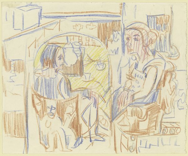 Curator: Gazmend Freitag's work, titled "Ich mal mir die Welt," or "I Paint Myself the World," was created in 2021. Freitag works across multiple mediums, but this is a pencil drawing on paper. Editor: There's a beautiful dreamlike quality. It has such raw energy to it, almost chaotic with the rapid strokes of the pencil yet grounded by the earthy color washes. Curator: Given the title, it suggests an element of world-building. Freitag may be channeling the tradition of the artist asserting control over their reality, a particularly poignant gesture considering some of the socio-political challenges artists encounter. Editor: I see the framing of these distinct vignettes as the artist bringing multiple perspectives into a single space. This intersection emphasizes how we perceive things is subjective and the artist appears to be showing his various encounters of his environment. Curator: Note, too, how each figure seems self-contained, disconnected. Is this Freitag’s comment on the human condition? Or could this be the result of displacement and fragmentation that impacts much of Freitag's cultural background? Editor: Perhaps. Look closely at how the artist uses the weight and directionality of the pencil lines. See how it pulls your eye from the central nude figure over towards the man drinking the coffee? It creates interesting visual connections, even among disparate scenes. The open composition provides many opportunities to explore the artist's world-building. Curator: Exactly. We see this interplay of the public and private sphere that reflects our modern society and challenges the perception of art's role within it. Editor: It really invites the viewer to wander, doesn't it? The visual language—those rapid, expressive lines—almost screams, "process." I can feel the artist's hand at work here, the raw, immediate transfer of thought to paper. Curator: Indeed. "Ich mal mir die Welt" acts as an important statement regarding Freitag's perception of identity and creative sovereignty within a broader societal structure. Editor: A thoughtful rendering, it's a sketch that captures life, both simple and sublime. I leave feeling as though I briefly gained insight into a private world of Freitag.