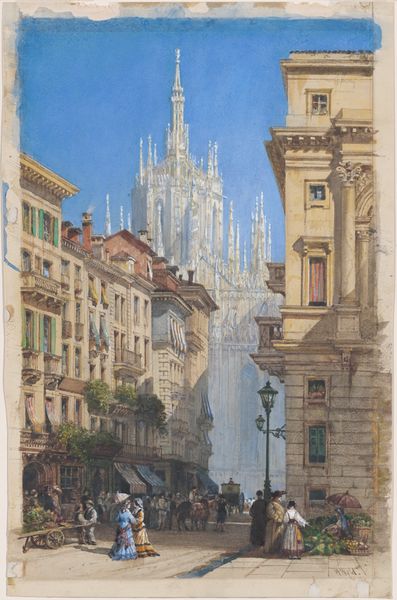 Editor: This watercolor painting, "Church of Saint Paul, Valladolid," created by Jenaro Pérez Villaamil in 1846, gives me a feeling of grandeur, but also almost… impermanence. It’s so delicately rendered, especially the facade. What symbolic weight do you think the Church might carry here? Curator: Villaamil captures not just the physical presence, but also the cultural memory embedded in this architectural icon. Think of the Baroque facade - a riot of sculpted saints, floral patterns, and heraldic shields. Each element functions almost as a visual mnemonic, a reminder of the Church's power and influence in Spanish history. The symbolism is deeply intertwined with Spain's identity. Editor: So, the ornamentation is intended to serve as a constant reminder? What does the architecture reveal? Curator: Indeed. The architectural symbolism speaks volumes about power. The soaring towers reach towards the heavens, representing a link between the earthly and divine realms, reinforced by the people gathered at the church, who would've sought connection, hope, redemption, or forgiveness from sins. The Baroque style, popular during the Counter-Reformation, aimed to overwhelm the senses and inspire awe. It becomes not just a church, but a statement. Editor: It's amazing how much history can be contained in one image. It really feels like more than just a picture of a church. It has captured Spain's religious power. Curator: Precisely. And Villaamil's delicate rendering almost elevates it. There is something poignant that communicates an inherent emotional charge.