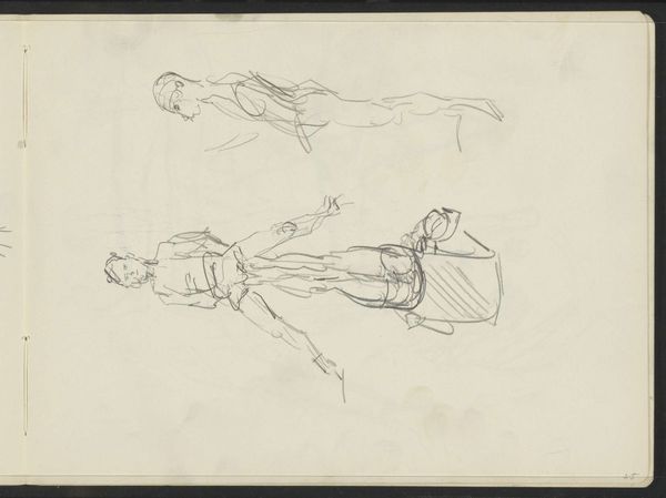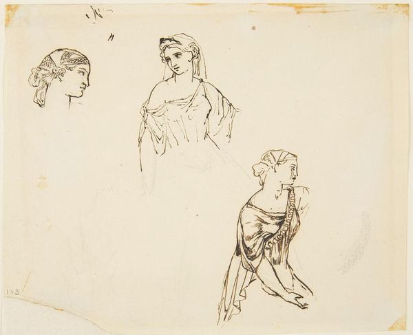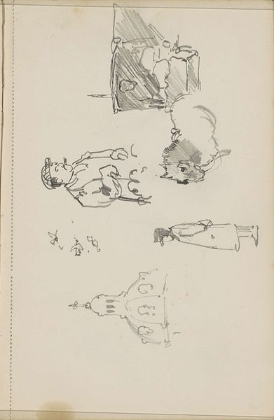 Johannes Tavenraat created this sketch of a boy with a hunting horn, hunters, and a hand with a pipe, using pen and brown ink. The composition immediately strikes you with its arrangement of figures stacked vertically. Tavenraat masterfully employs line and form to capture the essence of each figure with minimal strokes. Notice how the brisk, almost hurried lines convey movement and energy. Each character is economically rendered, but the details of their clothing and posture suggest a narrative richness. This sketch reflects a broader artistic interest in capturing fleeting moments, using the pen's fluidity to explore character and form, challenging traditional notions of portraiture and genre painting. It destabilizes fixed meanings by inviting the viewer to construct their own narratives based on the suggestive forms and gestures. The seemingly unfinished quality of the sketch invites us to consider how the artistic process itself becomes a subject, emphasizing not the final product but the dynamic interplay of line, form, and imagination.