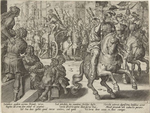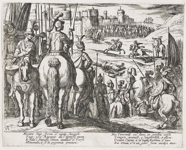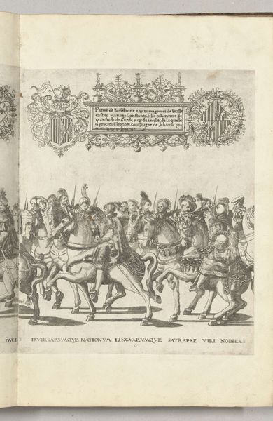Editor: This is Nicolaas Hogenberg's "Voetknechten met paarden, plaat K," an etching from around 1530-1536. The procession seems formal, almost regimented, in its arrangement. What do you see in the relationships between the figures depicted and the composition of the print itself? Curator: The interplay of light and shadow establishes a tonal range crucial to understanding the plate’s construction. Notice how the artist uses hatching and cross-hatching to define the forms of the figures and horses. The density of these lines creates areas of darkness, giving volume to the subjects, whereas the lighter areas are rendered with more delicate lines, indicating highlight and spatial recession. How might this relate to the overall effect that is conveyed in the procession? Editor: That makes sense. The contrast really does make the horses and riders pop! Does the positioning of the figures, particularly the placement of the horses' heads in the composition, create a sense of rhythm or visual movement? Curator: Indeed. Note how the repetitive arrangement of the horses—each mirroring the other—creates a pattern across the picture plane, engaging our gaze with its structural unity. It is through these strategic deployments of line, form and value that the artist invites us to appreciate the craftsmanship intrinsic to this visual experience, transcending any external reference. Do you notice how the formal coherence supersedes a specific narrative function? Editor: Now that you mention it, it almost feels like the process is more important than the story here! Thanks, I’ll never see processional imagery the same way again. Curator: It has been a pleasure to unveil aspects of intrinsic value and formal arrangement in this plate together!