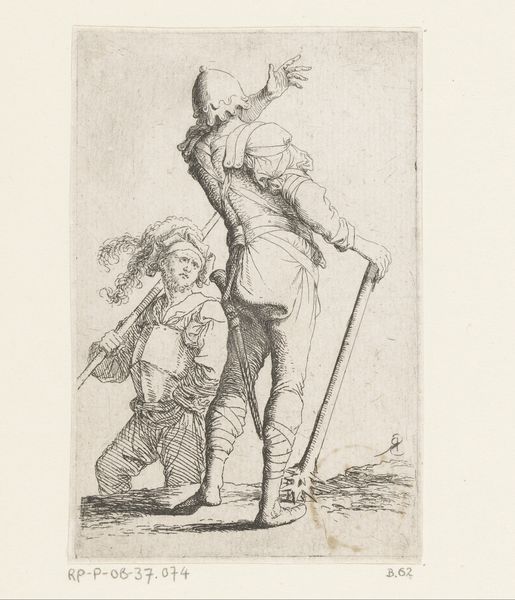 This etching, "Monkey Dandy" by Thomas Landseer, presents a comical and critical view of human affectations through the guise of monkeys. The formal arrangement immediately strikes you with its stark contrast in scale and detail. The 'dandy' is meticulously rendered with cross-hatching to define texture and form, emphasizing his opulent attire and self-satisfied posture, which is juxtaposed against the smaller monkey on the left. Landseer utilizes line and form to satirize human vanity. The dandy's exaggerated pose and costume elements are signs that mock the superficiality of high society. The composition, a clear foreground and background, directs our attention to the performative nature of the dandy. Landseer uses the monkey figure to question what it means to be cultured or refined and suggests that such pretenses are merely a form of mimicry. It invites us to reflect on how social roles are constructed and performed.