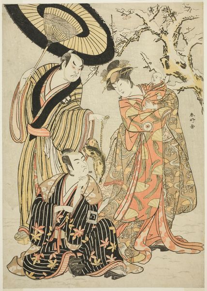 Editor: Here we have Okumura Toshinobu's woodblock print, "The Actor Hayakawa Hatsuse as a Flower Vendor," dating from around the 1720s. The patterns and colors are very striking; the way the vendor is situated amidst the flowers and bamboo lattice seems deliberate and perhaps symbolic. How do you interpret the symbolic relationship between the figure and the flowers? Curator: This is a beautiful example of early Ukiyo-e prints! Note how the actor, though depicted as a common flower vendor, exudes a sense of refined grace. The flowers themselves, what do they evoke for you? Editor: Well, flowers often represent beauty and ephemerality. Curator: Precisely! In Japanese culture, specific flowers carry distinct meanings. The placement of the actor amongst them infuses the scene with layers of symbolism. The cloud-like shapes printed onto the robe further amplify this sense of otherworldly drama. Consider also the hat’s distinctive form. Is that shape and its adornment accidental? Editor: No, not at all. It’s quite ornate. I wonder if it symbolizes something about his character? Curator: Exactly. The actor’s true profession is veiled, yet simultaneously emphasized through theatrical costume. The visual elements don't just represent reality, but a heightened, stylized version. The symbolic weight here rests on understanding societal roles and cultural meanings associated with flowers, attire, and performance. Editor: That's fascinating! So the print plays with these cultural symbols to comment on the performative aspects of everyday life and how social identities were constructed? Curator: Precisely. And notice that even this “everyday” figure seems self-aware. By incorporating flowers, attire, and pose, we're presented with a multi-layered portrait, rich with symbolism. This print speaks to the very constructed nature of identity within a cultural framework. Editor: I see that now. The flowers aren't just decoration; they're part of the story being told. Thinking about the interplay of identity and cultural symbolism is a new way for me to appreciate art. Curator: And remember how this continues through different times and places. These images keep speaking through culture.