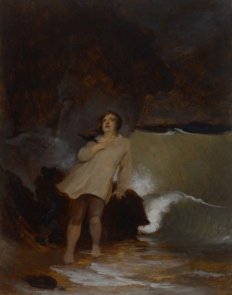 Thomas Sully made this oil on canvas, *Foot Impression in the Sand,* sometime during his career. It depicts a solitary, cloaked figure on a beach, reacting to a footprint in the sand. The painting evokes ideas of isolation and the sublime, very popular during the Romantic era. Sully was a successful portrait painter in the United States during the 19th century. But here he seems to explore deeper philosophical themes. Consider the painting's visual codes: the vast, indifferent ocean; the stormy sky. These suggest the insignificance of the individual in the face of nature. The footprint, a sign of human presence, raises questions about identity and existence. Is the figure alone, or is someone else nearby? The answers aren't available to us. As art historians, we examine the cultural context. The Romantic movement emphasized emotion, imagination, and the individual. Sully’s painting reflects these values, inviting viewers to contemplate their place in the world. By studying his letters and other writings we might better understand his artistic motivations, and place his work in the broader context of American art and ideas.
