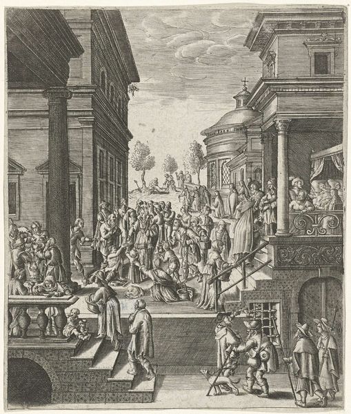 Abraham Dircksz. Santvoort created this print titled 'Pompée verbrandt correspondentie', which translates to 'Pompey burns correspondence', in the Netherlands sometime between 1634 and 1669. It depicts a scene from Pierre Corneille's play "Sertorius," which dramatizes the life of the Roman general. The print highlights the play's themes of power, loyalty, and political intrigue. In this scene, Pompey dramatically burns letters to symbolize his commitment to Rome and his rejection of any potential conspiracy. The burning of correspondence is a visual metaphor for severing ties with potential enemies and consolidating power. Santvoort's work reflects the Dutch Republic's fascination with classical history and theater. The detailed architectural background and the crowd emphasize the public nature of Pompey's act. To fully understand this work, research into the history of Dutch theater and the political climate of the 17th century is essential. The print reminds us that art is often a product of its time, reflecting and commenting on the social and political realities of its era.