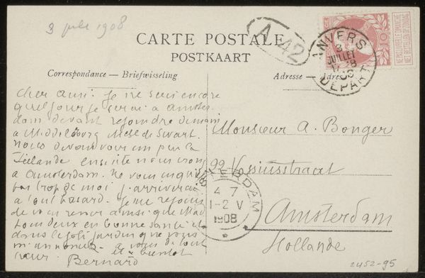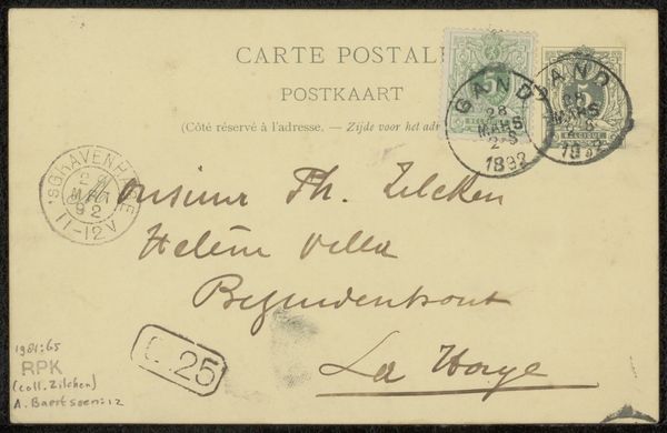 This is a carte postale, a paper postcard addressed to Philip Zilcken, "artiste-peintre" or artist-painter. The card was sent from the Hague, Holland, in 1886, by Willem Bastiaan Tholen, who was a Dutch painter associated with the Hague School. The Hague School was active during a period of significant social and cultural change in the Netherlands, as it moved towards modernization while grappling with its colonial past. Tholen and his contemporaries sought to capture the atmosphere and emotional resonance of the Dutch landscape and daily life. What stands out here is the intimacy of the communication, a personal note between artists in a time when the art world was becoming increasingly professionalized. As you look at the handwriting, consider the networks of artists that supported the development and dissemination of art in the late 19th century. Think about how artists supported each other, and how communication technologies allowed them to nurture their creative connections.