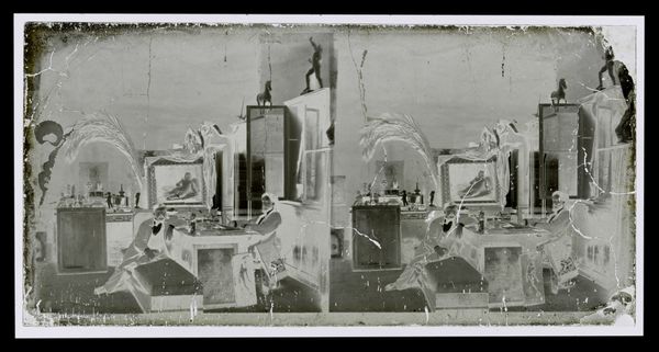This stereo card, "Interieur van het atelier van Laurens Lodewijk Kleijn in Rome," was created by Sommer & Behles. The photograph presents a stark, almost ghostly depiction of an artist's studio through the stark contrasts of light and shadow. The composition, divided into two panels for the stereoscopic effect, invites a deep visual analysis of the elements within. The studio space, filled with classical busts, sketches, and a model posing regally, seems to freeze a moment in time. The monochrome palette strips away color, emphasizing form and texture. The objects within the studio—each carefully arranged—create a semiotic system where classical ideals and artistic endeavors meet. The photograph captures not just a space, but a set of cultural codes and artistic values. The cracks and imperfections in the photograph emphasize its materiality, reminding us that this image is not just a representation but an object in itself, subject to time and decay. This interplay between representation and reality destabilizes our perception, forcing us to question the fixed meanings we assign to images.
