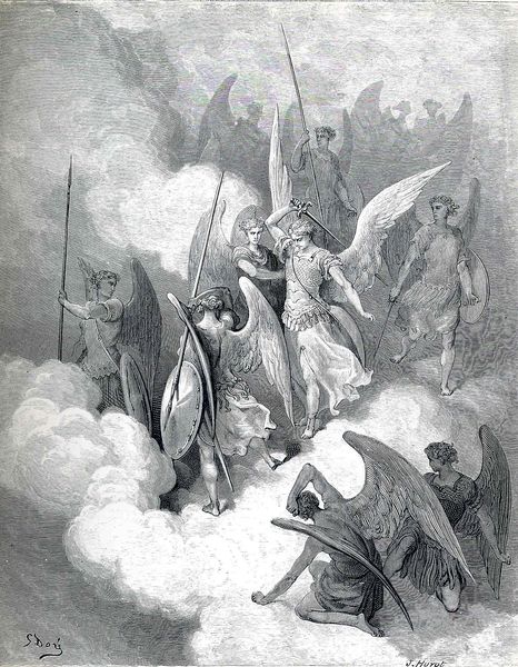 Editor: So, this is Gustave Moreau's "Saint Michael Vanquishing Satan" from 1882, and it’s done with oil paint, but almost has the quality of a watercolor. I'm immediately struck by the dramatic use of light and shadow and the intricate detailing of the figures. What do you see in this piece, focusing on its compositional elements? Curator: Observe how Moreau deploys color—primarily golds and blues—to differentiate and elevate St. Michael, whose physical attitude projects the active dynamism suggested by the artwork’s title. Note how the contrasting earthy tones are used in painting Satan, in order to tie that figure physically into the painted representation of the ground under him. Consider the expressive use of line throughout the composition: The undulating forms that articulate Satan's body contrast with the sharper, more angular lines used to define St. Michael’s wings and armor. Does that clarify his strategies? Editor: That helps, especially the contrasting tonalities suggesting that St. Michael represents enlightenment versus earth, and the way Moreau renders the physical and implied lines throughout the piece. But the symbolism feels very specific; should we be exploring what St. Michael's placement above Satan represents? Curator: The spatial relationships are also significant. St. Michael's dominance is reinforced not only through size and position but also through the dynamic lines that lead our eyes upward, a compositional device, if you will, reinforcing his victory. Do you observe the implied narrative communicated through purely formal elements? Editor: Now I see the power dynamic inherent in the overall structure, almost as if Moreau designed it to elevate Michael, down to his wings that echo the mountains below! I appreciate the structural and aesthetic breakdown! Curator: Indeed! And by focusing on these formal properties, we gain a deeper appreciation for the artist's technical skill and compositional decisions. It is through such detailed examination that the narrative power comes through so effectively!