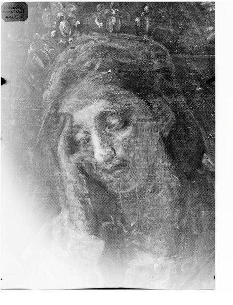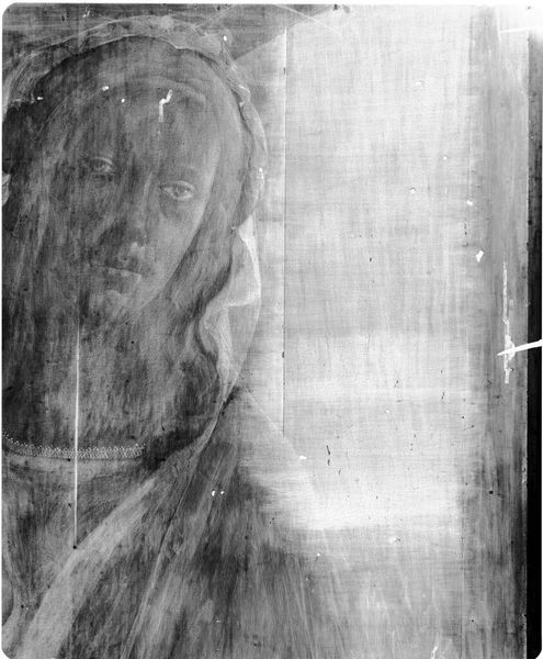 Curator: Here we have an X-radiograph of "Magdalen" attributed to El Greco, currently held at the Harvard Art Museums. The film itself measures 14 by 17 inches. Editor: The image is striking. Even in this ghostly form, the upward gaze and ethereal quality are captivating, hinting at the raw emotion present in the original painting. Curator: Indeed. X-radiography allows us a glimpse beneath the surface, revealing the artist's process. We can see the underpainting, the initial layers that shaped the final image, offering insights into El Greco’s technique. Editor: Seeing the bones, so to speak, highlights the vulnerability inherent in representing a figure like Mary Magdalene, often portrayed as both sinner and saint, a complex figure grappling with repentance and redemption. Curator: Absolutely, and this technical view helps us understand how museums and galleries utilize technology to study and preserve art, shaping our understanding of art history. Editor: It's a reminder that artworks are not static objects but products of a specific social and art historical moment. It underscores the politics inherent in how we interpret and present these images to the public. Curator: This has certainly offered an interesting perspective. Editor: Agreed. It layers another level to the narrative.