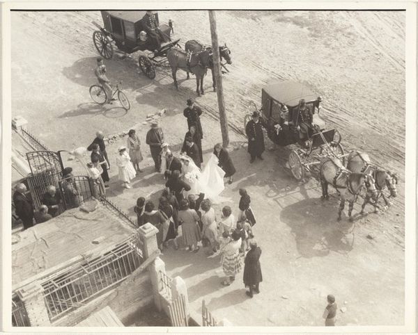 Curator: This gelatin silver print, titled "The Market, Aswan, Egypt," was captured by Paul Strand in 1959. Editor: My initial impression is a feeling of organized chaos. The composition, viewed from slightly above, presents a tightly packed scene, primarily in tones of grey and cream. It feels incredibly dense, like you could almost hear the murmur of the crowd. Curator: It’s interesting that you use the word "organized." I see it too—this photograph manages to encapsulate a cultural crossroads. Markets like this, traditionally gathering points for commerce and connection, are enduring symbols of communal life. The light in this picture almost sanctifies the everyday. Editor: From a formal perspective, the image balances overall texture with strong geometric forms. Consider the cylindrical forms, the flat rooftops, then your eyes are driven again across all the smaller textural details within. The buildings themselves are cubic forms against a central circular building—perhaps a religious or civic space? The high contrast also creates a dynamism that propels your gaze through it. Curator: Yes, and look how Strand utilizes those figures to build the image’s layers. Those darker-clothed figures moving around give it such movement—while those clad in lighter fabric seem to be waiting, selling, maybe just existing in the margins. It resonates on a cultural memory level, and even psychological. The dichotomy, as it exists across so many civilizations, feels ancient and vital. Editor: What I find fascinating about Strand's method in this image, it the absence of traditional depth-creating strategies. This gives the image the feeling of an intimate surface while also offering an expansive portrayal. The use of monotone in combination with sharp details contributes to a timeless effect. Curator: Indeed, and it brings forth questions on cultural resilience, a subtle resistance to imposed norms or a simple statement about continuity. Seeing that simple architectural curve next to people practicing daily habits—there is an essence that carries through time. Editor: In summation, a closer look unveils a tightly crafted and wonderfully dynamic composition from Paul Strand. Curator: Yes, capturing a moment of cultural expression frozen in time.