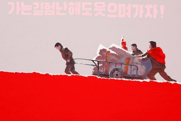 Sun Mu created this painting, Ideology, using acrylic paint to depict a moment of unity. The image presents a stylized depiction of South Korea's President Kim Dae-jung and North Korea's Kim Jong-il clasping hands against a backdrop that mimics the Korean Peninsula's flag, or Taegeukgi. The pink and blue of the flag's central swirl are inverted, perhaps to suggest the artificiality of this apparent coming together. Made by a North Korean defector living in South Korea, this artwork speaks volumes about the complexities of inter-Korean relations. To fully appreciate Sun Mu’s work, we might delve into the history of the division of Korea, the Korean War, and the subsequent political ideologies that shaped the two Koreas. Such research illuminates how this painting engages with and critiques the political theater of reconciliation. It reminds us that the meaning of art is always enmeshed with the social and institutional contexts in which it is produced and received.