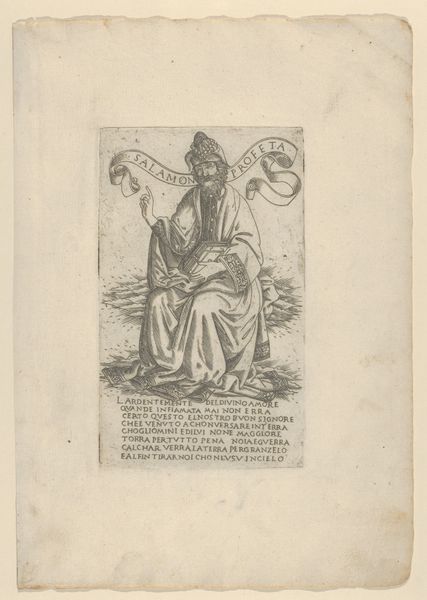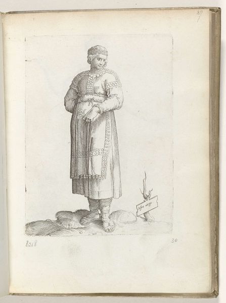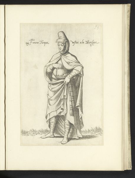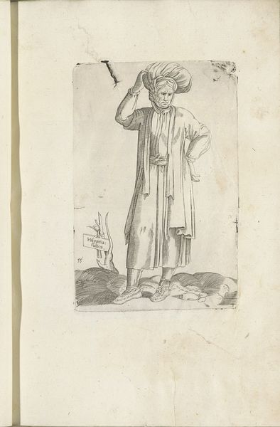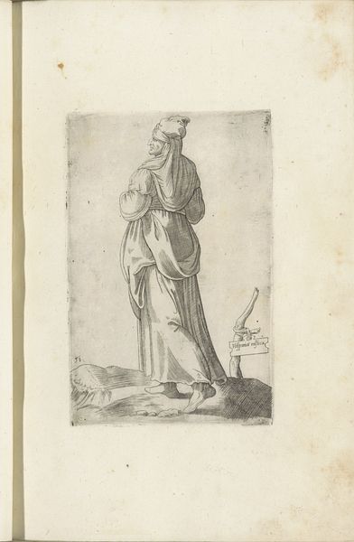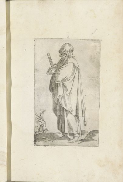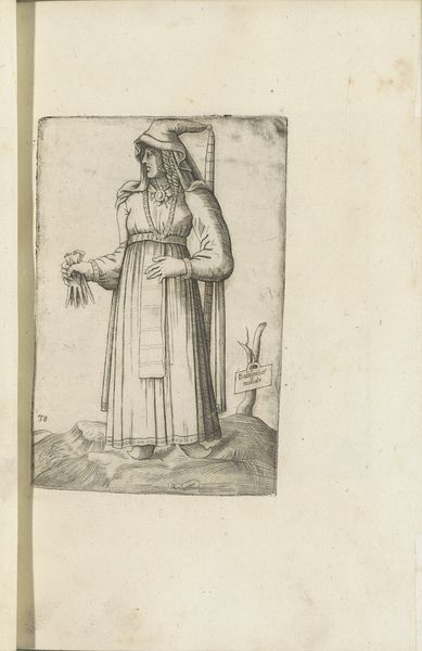 Editor: Here we have "Spaanse Vrouw," or "Spanish Woman," a drawing made around 1569 by Ferando Bertelli. It's done with pen and pencil on paper, and you can really see the light pencil work. There's a delicacy to the lines that I find striking. What catches your eye in this drawing? Curator: Immediately, I'm drawn to how the artist renders this figure as a vessel of cultural memory. Note the deliberate staging – her gesture, almost an offering, is echoed in the placard beside her. It evokes not just an individual but an idea *of* "Spanish Woman," loaded with meaning for its contemporary audience. What feelings does her attire trigger for you? Editor: I’m not sure, I guess it evokes… modesty? A certain level of wealth, perhaps, but… subdued? Curator: Precisely. Observe the layers, the covering of the head – symbols that carry weighty historical significance about women, status, and nationhood in the 16th century. It prompts the question: Is this a portrayal or a carefully constructed representation intended to communicate certain ideas? Notice the lack of overt ornamentation which serves to communicate a sense of seriousness of purpose. How might this lack of flourish influence its viewers? Editor: That's interesting… by stripping away some of the adornments, the artist emphasizes the figure's stoicism. It makes her seem both vulnerable and resolute, almost. Curator: Yes, precisely, the symbolic sparseness amplifies a complex internal world. Art, here, acts as a cultural mirror. Editor: This makes me think about how symbols persist and transform. It is so interesting to think about what meaning gets carried on through them across the years. Curator: Exactly. I hadn't considered that parallel so directly before either!