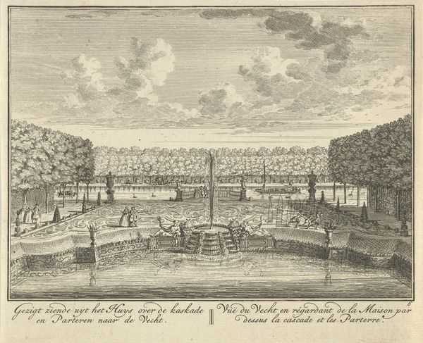 Editor: Here we have Daniël Stopendaal’s “View of the Garden and Pond of the Driemond Estate,” an etching from 1790. The composition feels very controlled, almost sterile. How do you interpret this work? Curator: The controlled nature reflects the values of the elite at the time. Consider how landscape design became a powerful tool for expressing dominance over nature and, by extension, social hierarchies. Think about the labour that went into creating and maintaining such a space, the access and privilege embedded within it. Does the scene speak to ideas about power, class, or control? Editor: That makes me think about the figures within the landscape; they seem almost incidental, just placed within this scene, not actually part of the overall image. Curator: Precisely. And that’s something we should interrogate further. Who are these figures? What are they doing? The fishing, the strolling... It speaks to leisure and wealth. How does it speak to gender roles of the time? Consider the potential audience for this print: what would they understand from this representation of leisure and cultivated nature? Editor: So the print isn't just showing us a pretty garden; it's reinforcing societal structures and norms. Curator: Exactly. By understanding the context – the social, political, and economic landscape of the late 18th century – we can begin to unpack the complex messages embedded in what at first glance seems like a simple depiction of a garden. It encourages us to be critical of what we see and to think about who is included and excluded in the narrative. Editor: This makes me appreciate how much historical context can inform an understanding of art. Curator: And hopefully it will also remind you to continue questioning those contexts too!