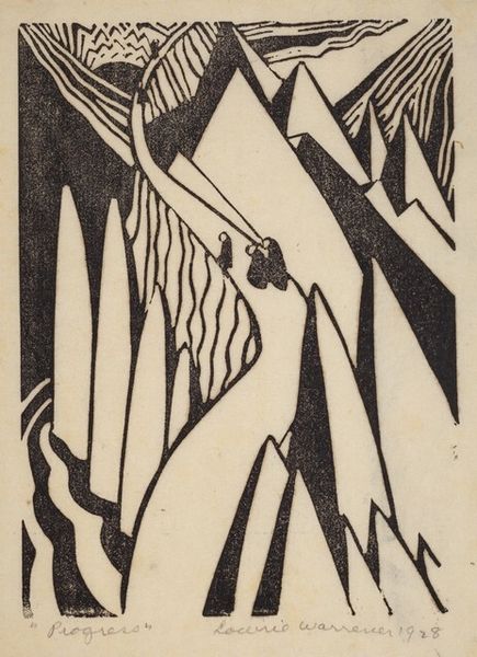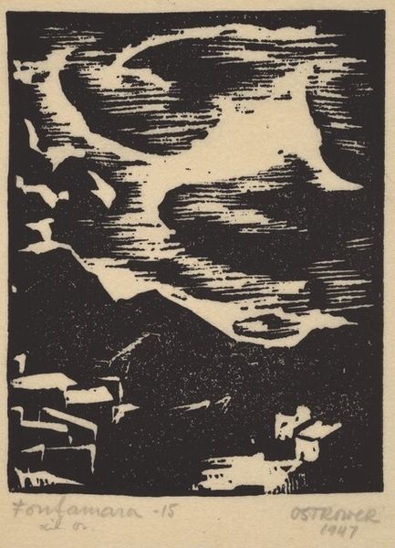 Editor: Fayga Ostrower’s woodcut print, “Fontamara X,” created in 1947, presents a stark, black and white image. It feels heavy, burdened. There are two figures in the foreground, with what seems to be a mountainous landscape behind them. What strikes you most about this piece? Curator: The emotional weight is definitely palpable. I’m drawn to consider this work within its historical context, particularly post-World War II. How might the concept of displacement and the struggles faced by marginalized communities be influencing the artist’s portrayal here? Editor: So you're seeing the figures as potentially representing a specific community affected by these larger historical events? Curator: It's compelling to view the landscape not just as scenery but as a symbol of hardship, a constant oppressive force in their lives. Notice how the lines depicting the mountain seem almost violent, pressing down on the figures. The print itself, as a reproducible medium, opens questions surrounding accessibility, challenging elitist approaches to art appreciation. Do you see a connection between this artistic choice and Ostrower's potential socio-political intentions? Editor: That's a perspective I hadn't fully considered. I was focusing on the subjects' apparent dejection. But thinking about the woodcut as a medium for wider distribution definitely reframes it. Curator: Exactly. It invites us to question who has access to art and whose stories are being told. Ostrower was teaching art to underprivileged communities at the time. Considering this intersectional element enriches the work, don't you think? Editor: Absolutely. Looking at “Fontamara X” with a focus on the social context and accessibility really transforms my understanding. I see more than just a melancholic scene. Curator: Indeed. Art becomes powerful when viewed through a critical lens, acknowledging the complexities of identity, history, and power.