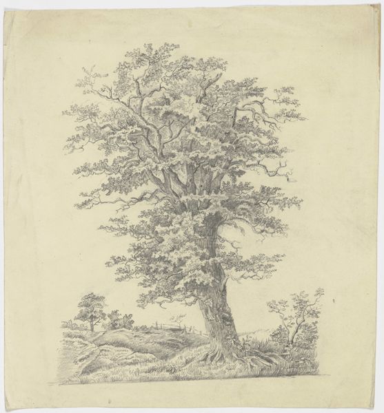 Curator: Ah, this piece… Looking at P.C. Skovgaard's “A Large Beech Tree with Green Foliage," painted around 1840, evokes a kind of quiet majesty, don’t you think? It's deceptively simple, a tree rendered in watercolor. Editor: My first thought? Timeless. There’s something fundamentally comforting about it. The beech, that symbol of steadfastness, painted with such gentle fluidity. Curator: Exactly. And beech trees were, and in some ways still are, deeply intertwined with Scandinavian identity. It’s not just a tree; it's a rooted symbol of homeland, of heritage. Its widespread, almost globe-like canopy is a common symbol of refuge and abundance. Editor: You see the homeland; I see the personal landscape. The way Skovgaard has rendered the light filtering through the leaves...it reminds me of half-remembered summer afternoons as a kid, dappled shade, whispered secrets. Is that romanticism shining through, maybe? Curator: Precisely! Romanticism, absolutely. This wasn't about botanically accurate representation, but about capturing a feeling, an emotional response to nature. Even the plein-air technique feeds into that; he’s right there, present with the tree, absorbing its essence. The seemingly light colouring reflects an almost airy experience; this is a day in a memory. Editor: It makes me think about the continuity of symbols, the power that certain images, like trees, hold across centuries and cultures. Even now, a lone tree on a hill carries a particular weight in our collective psyche. I like how simple the image is overall. No overworking. Curator: Absolutely, it’s like a pure expression. We both walk into its peacefulness differently, you and I, but find our way there, nonetheless. A gentle meditation of paint and place and shared feelings. Editor: A bit like looking into a quiet mirror. I come away a bit calmer than before.