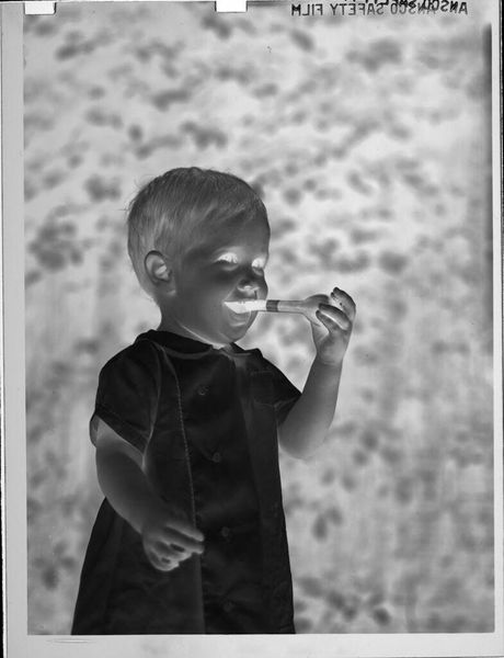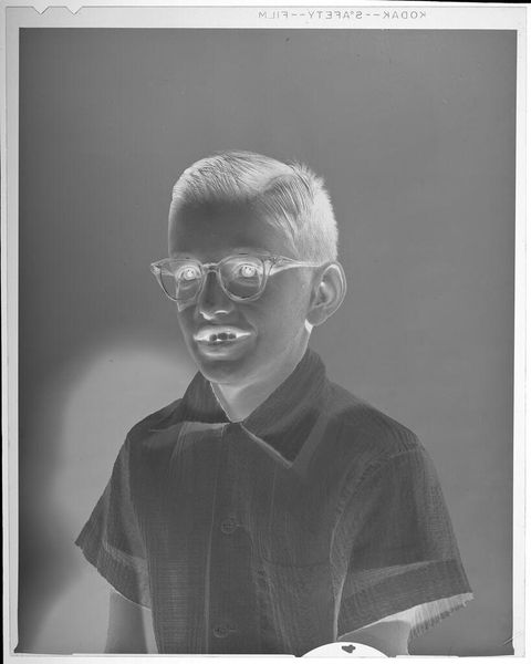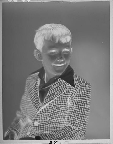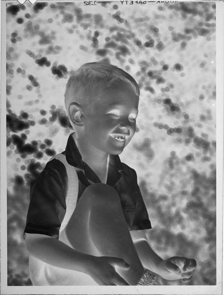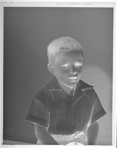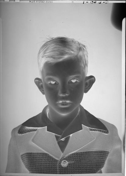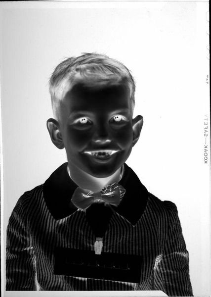 Editor: This photograph, "Untitled (boy in cowboy shirt)" by Lucian and Mary Brown, presents an intriguing inversion of light and shadow. The boy's radiant shirt contrasts starkly against the darkened background. What visual dynamics strike you in this piece? Curator: The image compels through its manipulation of positive and negative space. Note the texture of the shirt, which, despite its tonal inversion, retains a tactile quality. How does the reversal alter your perception of the subject's expression and demeanor? Editor: It's unsettling. The brightness gives him an almost spectral appearance, hiding his true emotions. Curator: Precisely. The interplay between light and shadow is not merely representational, but fundamentally transformative. The semiotic weight shifts, creating ambiguity. Editor: I never considered how much the inverted tones could affect the emotional reading. It's more than just a reversal of light, it's a reversal of feeling. Curator: Indeed. The photograph challenges us to reconsider how we perceive the familiar, transforming the mundane into something profoundly strange.