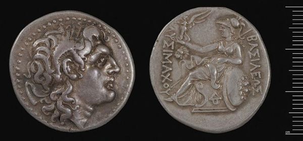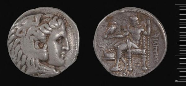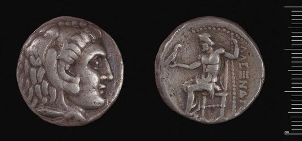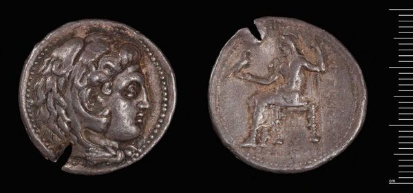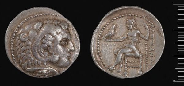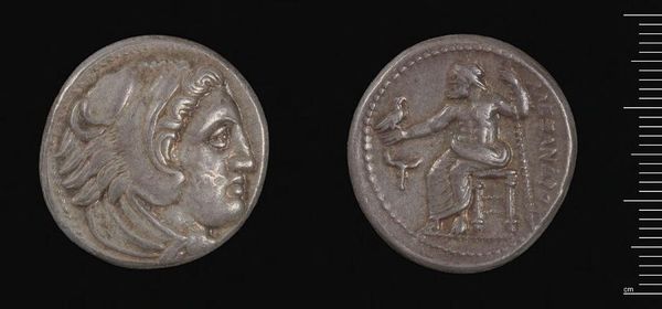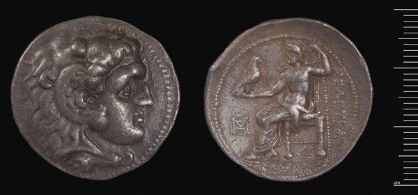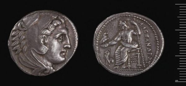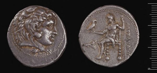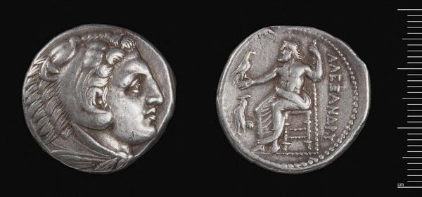 Editor: This is a silver Tetradrachm of Alexander the Great, from Babylon. It feels weighty, both literally and figuratively. What lasting symbolic power do you see embedded in it? Curator: Consider the lion scalp headdress. It isn't merely decorative; it's a direct appropriation of Heracles, linking Alexander to divine strength and heroic legacy. Doesn't it speak volumes about his ambition? Editor: Yes, that's such an intentional choice. And the seated Zeus on the reverse? It’s all so carefully constructed. Curator: Indeed! Zeus, holding an eagle, signifies authority, law, and cosmic order. This wasn't just currency; it was carefully crafted propaganda, promising stability and divinely sanctioned rule. Are we still affected by its imagery, do you think? Editor: Definitely. Seeing these symbols, knowing their context, makes this coin so much more than just money. Thanks!