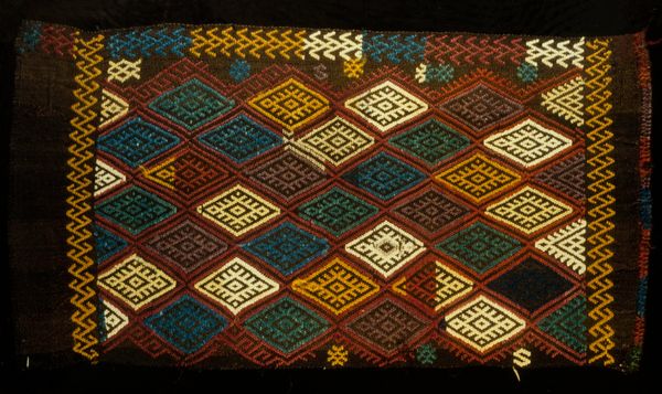 This camel bag was created by an anonymous maker, using weaving techniques. Camel bags are woven containers made from wool, used by nomadic people to transport goods. The bag's intricate geometric patterns in red, gold, and green were produced using a traditional weaving technique. The tight weave structure and design, determined by the interlacing warp and weft, give the bag its durability and visual appeal. The maker would have used a loom, carefully interlacing threads to create a dense fabric able to withstand the rigors of travel and transport. The labor invested in the production of this bag is significant. From the sourcing and dyeing of wool to the meticulous process of weaving, each step reflects the skilled tradition of textile production, which would have been essential to nomadic life. By emphasizing the making of the bag, and its functionality within a specific cultural context, we can move beyond the categories of fine art and craft.
