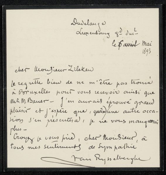 Editor: Here we have "Brief aan Philip Zilcken," or "Letter to Philip Zilcken," thought to be from 1893, made by Théo van Rysselberghe. It's ink on paper, and the neat cursive gives it an immediate sense of intimacy. The somber, dark ink also hints at a more serious tone, despite its everyday form. What feelings or deeper meanings does this letter evoke in you? Curator: You know, it’s fascinating how a simple note can transport us. To me, this letter whispers of the Symbolist movement, where artists explored inner worlds and emotions through subtle suggestion rather than direct representation. The very act of writing, in that period, felt almost sacred, didn’t it? This wasn’t just communication; it was an intimate sharing of the soul, you see? Editor: Definitely. Knowing that it may relate to Post-Impressionism too adds to its appeal. Curator: Precisely! Rysselberghe, teetering between Impressionism and Symbolism! He seems to be grappling with the constraints of reality and expressing his melancholy over missing an exhibition, perhaps. Think of it – each stroke of ink, a deliberate dance between conveying information and hinting at deeper currents. Doesn't that handwritten script feel so…personal? Do you get a sense of how urgent, or perhaps resigned, he sounds? Editor: I can see that. It's a window into a specific moment. I didn't think I'd find it so intriguing, a handwritten letter of all things! Curator: Isn’t it wonderful how something seemingly mundane can be so revealing? Like catching a glimpse into another person's world for a fleeting second.