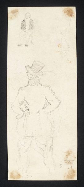 Editor: Here we have Victor Müller's pencil drawing, "Caricature View of a Man with a Top Hat in Profile to the Right," dating from sometime in the 19th century. It has a raw, unfinished feel to it, almost like a quick study. What’s your interpretation? Curator: This drawing embodies the emergent public sphere of the 19th century, specifically how caricature served as social critique. The pencil medium underscores its function as a reproducible image, accessible to a wider audience through printmaking. Do you see the commentary in the man's exaggerated features and austere dress? Editor: I guess I do. It feels like the drawing pokes fun at the seriousness and rigidity of the upper class. But what about the museum setting? Does the shift in context from street to museum change the reading? Curator: Absolutely. The institutional framework of a museum transforms a potentially subversive street caricature into a historical artifact. We sanitize the original rebellious intent when we display it in these hallowed halls. Is it possible, then, that museums participate in controlling what sort of imagery persists through history? Editor: That's a very good point! The museum essentially legitimizes and neutralizes what may have been a form of protest or social commentary. Something originally intended to critique power ends up enshrined by power. Curator: Exactly. And that’s something worth pondering when we view any work of art: whose voice is amplified, and what social structures are at play? Editor: I’ll definitely keep that in mind moving forward. I had only considered how things influenced artists to create but not how institutions give power to works and strip away what might threaten that power. Curator: It's a crucial component often overlooked. This one drawing becomes a fascinating case study!