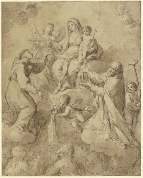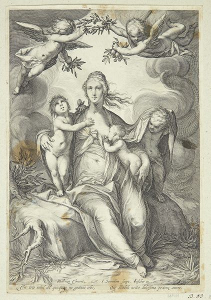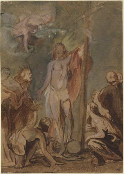 Charles Howard Hodges created this aquatint print titled "Kruisafneming", likely in the late 18th or early 19th century. Aquatint is a printmaking technique that simulates the effects of watercolor, using acid to etch a tonal pattern on a metal plate. Hodges, active in the Netherlands, was known for his portraits and reproductions of older paintings. Here, the aquatint medium lends a soft, atmospheric quality to the emotionally charged scene of Christ's removal from the cross. The textured surface of the print, achieved through the careful application of resin and acid, mimics the subtle gradations of light and shadow found in paintings. Consider the labor involved: the artist's hand in preparing the plate, the repetitive action of printing, and the distribution of the image to a wider audience. This reproductive method allowed for broader access to religious imagery, extending its reach beyond the realm of unique, hand-painted artworks. Hodges's choice of aquatint democratized art, making it available to a growing middle class, thereby blurring the lines between traditional fine art and commercial printmaking.
