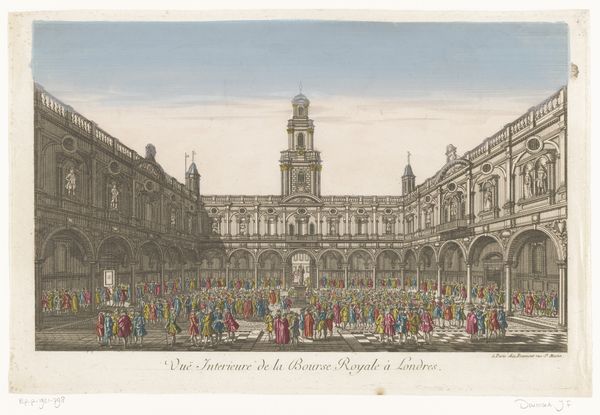 Curator: Ah, here we have a print titled "Gezicht op het interieur van de Royal Exchange te Londen," or "View of the Interior of the Royal Exchange in London." It dates from 1745-1753 and is housed right here in the Rijksmuseum. It was created by Robert Sayer, and he's used a combination of engraving and watercolor. Editor: Wow. The sheer busyness of it! It’s a swarm of tiny, colorful people packed into this grand architectural space. It makes me think of a very elaborate ant farm… but with powdered wigs. What was all this hubbub about? Curator: The Royal Exchange was a pivotal institution in the burgeoning financial world of 18th-century London. It served as a center for trading stocks, commodities, and insurance, effectively shaping early global commerce. Editor: Right. I can imagine all the deals going on there at the time. All this Baroque splendor just feels like putting lipstick on what amounts to rampant financial speculation. Is this print in color originally, or was this added later? It gives a touch of joy. Curator: The watercolor would have been applied by hand after the initial engraving, offering a certain liveliness to the print. These additions add a contemporary element of consumption, enhancing its value and appealing to a diverse market. The Exchange had an undeniable influence on everything that occurred in society. Editor: Thinking about those colors, the artist didn’t go wild, it is pretty toned down so we feel the focus isn't meant to be pulled in different directions by a flashy use of bright pigments, rather stay with the central subject as much as possible. Look at the people depicted! Curator: Absolutely! The depiction of individuals within such a space underscores the increasing prominence of merchant activity in society. What appears to be a genre scene speaks of larger power structures and socio-economic mobility. Editor: It's like stepping back in time and eavesdropping on history itself! I mean you can almost smell the wealth in that throng. Fascinating! Thanks for giving context on such a magnificent view, indeed. Curator: My pleasure. Seeing it contextualized reveals deeper layers that enrich our interpretation.