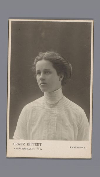 This photograph, titled "Portret van een onbekende vrouw," was captured by David Holmqvist. It’s a small work, a muted palette, a snapshot of someone lost to time. What I find so interesting is the way the light interacts with the fabric of her dress, creating a series of stripes that almost vibrate. It's a play of light and shadow, a subtle dance that animates the surface. You can almost feel the texture of the cloth, the way it folds and creases around her body. There’s something very tangible about that. The collar with its tiny pearls seems to pull the whole composition together. It’s a small detail, but it adds a touch of elegance, a glimmer of light that contrasts with the somber mood of the portrait. I am reminded a bit of the portraits by Whistler, that same interest in capturing a mood rather than just a likeness. What’s compelling to me is the way it captures the essence of a moment, a fleeting glimpse of someone's life.