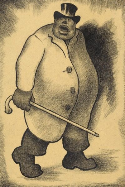 Curator: This is Sir Max Beerbohm’s depiction of "Rossetti in his Worldlier Days Leaving the Arundel Club with George Augustus Sala," part of the Tate Collections. Editor: It's immediately striking. The exaggeration of form, especially the corpulence, creates a mood that's both humorous and slightly unsettling. Curator: Beerbohm's caricature is potent. Rossetti is presented in shadow, literally and figuratively. Sala's cigar and expansive figure suggest worldly indulgence. It hints at the shifting cultural values of the time. Editor: Absolutely. The color palette—the muted blues and grays—contributes to the somber, almost ghostly, atmosphere. It really emphasizes the weight of these figures. Curator: Indeed. This drawing serves as a potent symbol of Victorian society’s changing values and the artist’s sharp observations. Editor: And Beerbohm's keen formal choices amplify that social commentary so beautifully.