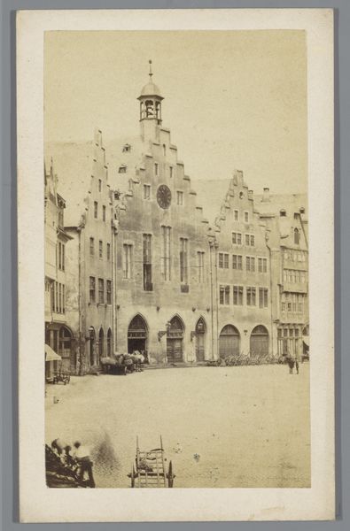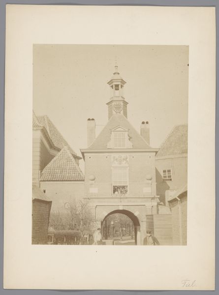 Editor: Here we have a photographic print titled "Gezicht op het stadhuis van Konstanz," taken between 1870 and 1871 by German Wolf. The sepia tone and formal composition create a rather serene and orderly feeling. What strikes you about this image? Curator: The architectural forms command immediate attention. Observe the calculated interplay between the geometric rigidity of the building's facade and the gentle curves of its arches. This deliberate contrast generates visual tension and contributes to a balanced composition. The carefully planned arrangement of space emphasizes symmetry. Consider how this reinforces the formal, public function of the stadhuis itself. Do you notice any visual elements disrupting this harmony? Editor: Well, perhaps the vegetation softens the rigid geometry a bit? The trees and landscaping introduce organic forms, providing a counterpoint to the constructed environment. Curator: Precisely! The softness and the variation within the vegetation serve as a counterpoint, offering a tactile richness that balances the austere architectural details. Let's also acknowledge the light itself. The image suggests soft, diffused lighting. Can you deduce how that contributes to the artwork's impact? Editor: The subtle gradations in tone across the stone might highlight its texture and age. It gives it an ethereal quality. Curator: Correct. Through light and shadow, Wolf directs our gaze and heightens the emotional resonance of the subject matter, offering layers of visual exploration. I find the artist's arrangement fascinating. Editor: I agree. I hadn't noticed how much Wolf balances geometrical patterns with just the right amount of organic irregularity. It brings such depth.