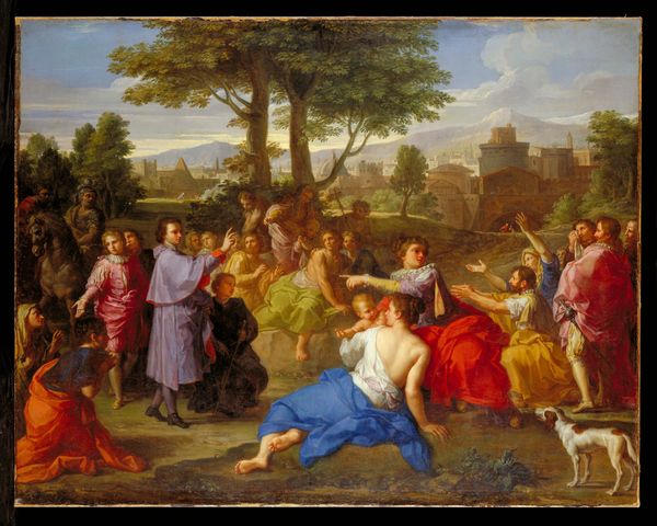 Curator: Sebastien Bourdon, circa the 17th century, offers us "Moses Defending the Daughters of Jethro." Painted in oil on canvas, this work is proudly held here at the Minneapolis Institute of Art. Editor: Immediately striking is the careful balancing act between pastoral serenity and sudden action; there's a tension in the figures’ stances, especially in the vibrant reds pulling my eye from the cool backdrop. Curator: That vibrant red indeed accentuates the narrative. Bourdon captures the moment when Moses intervenes to protect Jethro's daughters from oppressive shepherds. Notice how the spatial organization itself mirrors this disruption; the receding landscape and classically rendered architecture contrast with the active foreground. Editor: The positioning feels calculated. Note how the women are arranged along the aqueduct creating horizontality, a symbol of civic order or maybe female pastoral idyll. Conversely, the conflict happens along a vertical plane with men aggressively taking up visual space. Does the spatial ordering underscore power relations? Curator: A pertinent observation! Consider the broader socio-political climate. The painting emerges within the tradition of history painting, used to demonstrate moral virtue. Moses, acting as protector and future leader, is depicted with heroic musculature, a figure of social order restoring stability through the exertion of force. It evokes the values elites aimed to inculcate in the broader populace, the very same values reinforced by institutional structures. Editor: I am interested in this Baroque aesthetic as a construction, perhaps as mythmaking; the poses seem contrived, a bit performative. The dramatic lighting – chiaroscuro highlights the heroics, but isn't quite grounded. The painting's construction becomes transparent. Curator: Transparency or careful construction? What might seem performative might equally express underlying structural principles of harmony and balance so critical to Bourdon's moment. His handling of color and form echoes Poussin, with classical rigor mediating any excessive theatricality, to create not simply emotion, but rational clarity. Editor: Regardless, this tension offers valuable insights, from power relations to gender to pictorial structures; its social reflections intertwined with its stylistic choices. Curator: Indeed, it exemplifies the profound interconnectedness, offering enduring material for exploration.