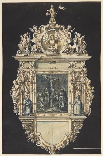 Curator: This caught my eye right away – a sort of hazy vision of holy architecture, or what holy architecture might become. It's just fluid, almost dreamlike. Editor: This watercolor and ink drawing presents a "Design for an Altar with the Annunciation in the Central Panel." Attributed to an anonymous artist and created sometime between 1700 and 1800, it's part of the Metropolitan Museum of Art's collection. Curator: I feel like the anonymous hand wanted to capture the Baroque spirit, you know? That over-the-top energy—but just barely restrained it in the end. All that heavy stone filigree imagined here, yet sketched so delicately. The angels seem to float out from the altarpiece. Editor: Well, such preparatory drawings were crucial. An architect, a sculptor, or a patron would use a detailed sketch like this to visualize the project before committing resources. You can almost see the design evolving on the page. Note the classic Baroque hallmarks: the drama of the scene, the twisting columns, and of course, the divine light pouring down on Mary. Curator: And the light, definitely the light. All done in watercolor wash, it's so ephemeral and… and forgiving. You wouldn’t quite achieve that airy otherworldliness if it were sculpted from Carrara marble, would you? It makes me consider if rendering a sacred space with such gentleness itself could be seen as devotion. Editor: Perhaps the aim here was less about replicating reality and more about inspiring contemplation, especially given the role that imagery played in disseminating Counter-Reformation ideals. Imagine how impressive the completed project would have been as it proclaimed power and faith with ornate elements inside the church. Curator: I do wonder though if the artist felt at all burdened or freed by that charge when translating sacred, otherworldly events. Like…where does a painter locate themselves when drawing God's design? I do feel that tension, if it exists, lends another beautiful layer of humanity to the altarpiece. Editor: It prompts us to think critically about how cultural institutions once used artwork. The art became the central tools by which political and social structures spread messages to and shape public sentiment. Even the most ethereal vision had a down-to-earth purpose, as seen in this wonderful piece of architecture! Curator: Oh, certainly, what a lovely vision of devotion through structure. Editor: Indeed, this subtle dance between faith and design has offered us plenty to consider.