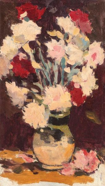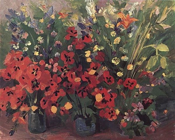 Curator: Welcome. Before us is “Bouquet of Flowers,” a 1946 oil painting by Martiros Sarian. Editor: The colors strike me first—deep indigos, flashes of white and pale yellow, all set against a vibrant, almost pulsating red backdrop. It has a distinctly melancholic atmosphere, but there's life, too, bursting from the canvas. Curator: Absolutely. Flowers, especially in still life, can be loaded with symbolic meaning. Given Sarian’s Armenian background, and that the piece was painted shortly after WWII, could the flowers here be coded for resilience and rebirth, emblems of cultural memory persisting through difficult times? Editor: Perhaps, but I'm more interested in how the paint itself performs. Notice the short, deliberate strokes. How Sarian builds volume with these touches of color—a purely formal concern. It's a deconstruction of form as much as a representation. There's an almost fauvist abandon to the palette, yet it feels balanced and structured. Curator: That’s interesting. But can’t we consider that flowers can represent certain shared experiences and are linked with folk traditions of the region and time period? Editor: Maybe so. The interplay between the subject and ground is fascinating. That red isn’t merely a background; it's an active participant, pushing the bouquet forward and adding tension. It subverts traditional perspective, flattening the space and challenging our perception. It's about color relationships as form, not a mimetic exercise. Curator: It's clear that you bring different eyes to it. I tend to delve into the weight these visual symbols may have over time, shaped by our own historical perspectives and the artists' past and roots. The symbolism speaks loudly here. Editor: And I focus on the how—how that symbolic potential gets structured, questioned, celebrated, or undone by purely visual means. That is all there is to see. Curator: It’s true; between the symbolic potential and the how, there lies something we should think about to broaden our perspective about an artwork. Editor: Indeed. It’s that constant negotiation that keeps us looking.