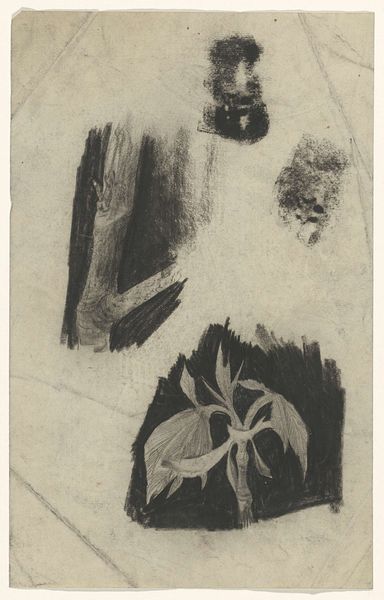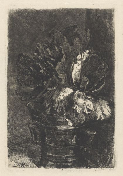 Curator: Well, this image certainly makes an impression. Morbidly intriguing. It’s giving me still-life vibes, but not the usual bright, abundant kind. Editor: This is “Dead Bird and Kettle on a Wall” by Barbara Elisabeth van Houten. It’s an etching made sometime between 1877 and 1950, a beautiful example of realism using ink on paper. It definitely captures a stark scene, doesn’t it? Curator: Yes, stark. I’d say heavy, even. All that darkness hanging… The weight of the kettle paired with the stillness of the bird creates a somber feeling. I almost feel like I can smell the metallic tang of the pot and something vaguely gamey... if that makes sense. Editor: It does. Consider the late 19th and early 20th century; realism as a movement wasn’t just about accurate depiction, but about portraying everyday life – sometimes uncomfortably so. Displaying death so plainly makes you wonder about Van Houten’s message. Is this a comment on human dependence on nature, or just an honest depiction of domesticity? Curator: I think the answer is yes and yes. Maybe that's the beauty of the print. There's an immediacy. Not just an attempt at reflecting what's "real" for viewers of the time, but a quiet observation about the dance between living and, well, *not* living. And as far as Van Houten's intent? Who knows? It feels more like she's saying "Here, *look* at this." Then steps back, silently inviting viewers to feel. Editor: Exactly. The lack of idealization typical of the era opens questions, doesn't it? Think about the burgeoning industrial revolution, disrupting traditional agricultural practices, or even urbanization drawing people from the countryside to burgeoning cities. Images like these became increasingly relevant. Curator: In a strange way, even beautiful. There's an undeniable artistry in the way Van Houten captured every detail: The kettle's curve and textures, the bird’s plumage… It makes you want to consider all that it evokes, whether it's mortality, practicality, or the often unseen facets of sustenance. Editor: Absolutely. There’s an emotional weight, prompting us to reflect on our relationship with mortality, culture, and also where it intersect—not as separate spheres but as deeply intertwined elements that are mirrored here. It reminds us how complex, nuanced and deeply resonant artworks from history can be. Curator: Thanks. I won’t look at a kettle quite the same way again.