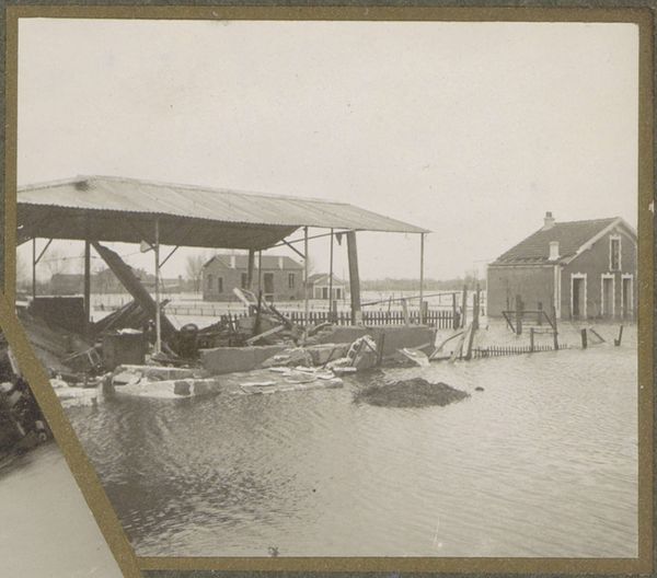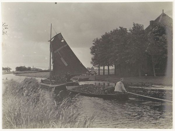 Folkert Idzes de Jong created this photographic print depicting a farm with a barn by the water, featuring boats in the foreground. The sepia tone evokes a sense of nostalgia, the image structured around the interplay between land and water, architecture and nature. Consider how the composition relies on the contrast between the solid, angular shapes of the buildings and the fluid, horizontal lines of the water. This juxtaposition establishes a visual rhythm, guiding the viewer's eye across the scene. Notice the bare trees that punctuate the skyline, their verticality offsetting the horizontality of the landscape, creating a tension that enlivens the composition. The materiality of the photograph, its grainy texture and muted tones, further contributes to the image's structure, emphasizing the play of light and shadow. This is not merely a depiction of a scene, but a study in form and texture. The photograph invites us to consider the underlying structures that shape our perception and understanding. It suggests a deeper engagement with the world, one that acknowledges the complex interplay between seeing and knowing.
