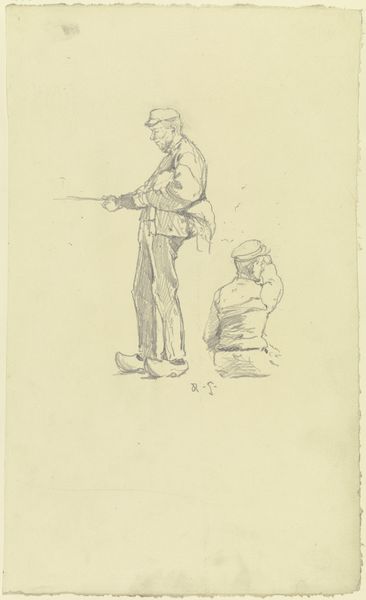 Editor: So, this is "Arbeiter aus der _Großen Spinnerei von Edam_," a pencil drawing by Rudolf Gudden from around 1894. It shows two sketches of workers. It feels so raw and immediate, almost like a snapshot. What strikes you most about it? Curator: What immediately captures my attention is the way Gudden depicts labor in this burgeoning industrial landscape. The men in their clogs and caps…they represent a particular class at a very specific moment in time. Think about the social dynamics: who typically got represented in art, and how? This is quite different, wouldn't you agree? Editor: Absolutely. Most portraits from that era were of the wealthy elite, not factory workers. The focus here feels almost…radical? Curator: Precisely! Gudden elevates these workers, drawing attention to their presence and contributions within society. It also raises questions about the role of the artist. Was he critiquing or simply documenting? What does the presence of two figures, one standing and one seated, suggest about the artist's intent, in that social context? Editor: It makes me wonder about their individual stories and their working conditions. Perhaps this was Gudden's way of giving them a voice. Curator: Exactly. Art like this reflects shifting power dynamics and the evolving relationship between art and the public. It demonstrates the potential for art to participate in broader socio-political conversations. Editor: I never really thought about art from this period as social commentary, but this sketch has completely changed my perspective. Thanks! Curator: And for me, it's a reminder of how even seemingly simple sketches can hold complex social narratives, demanding we look deeper into the public function of art.